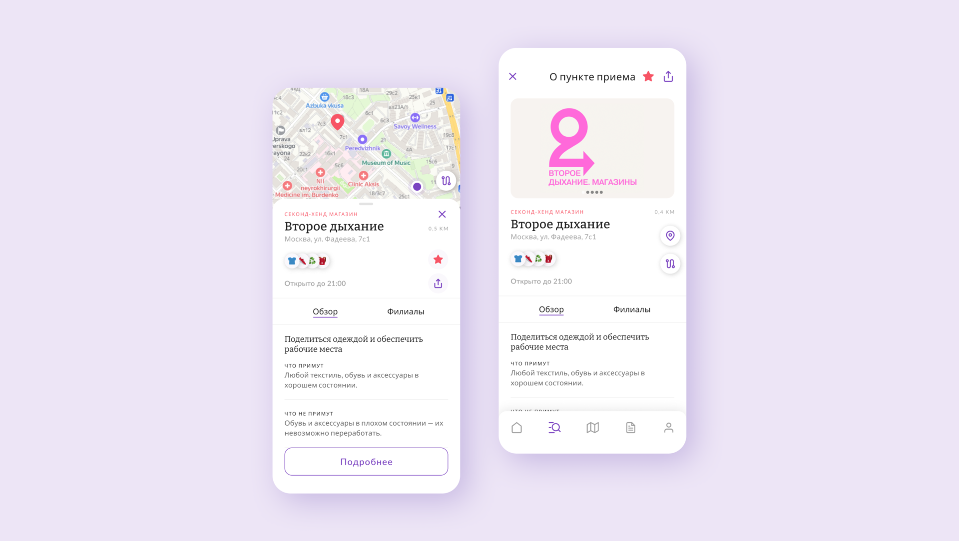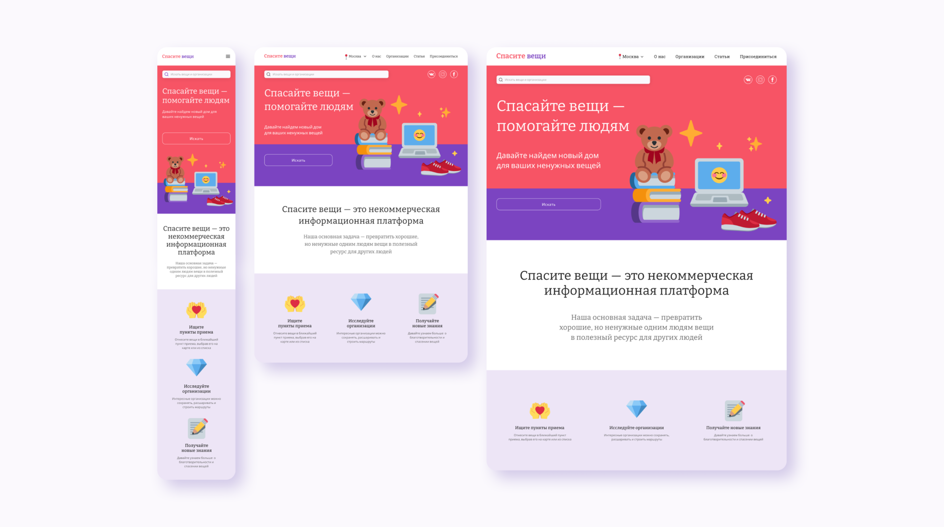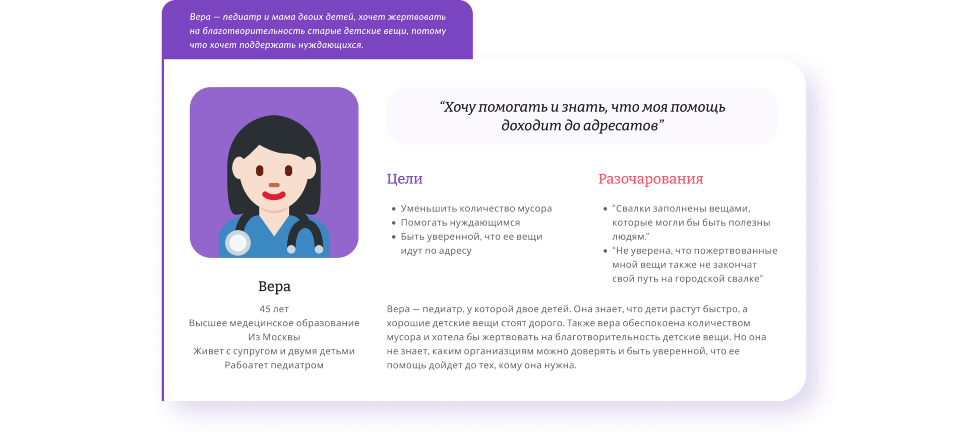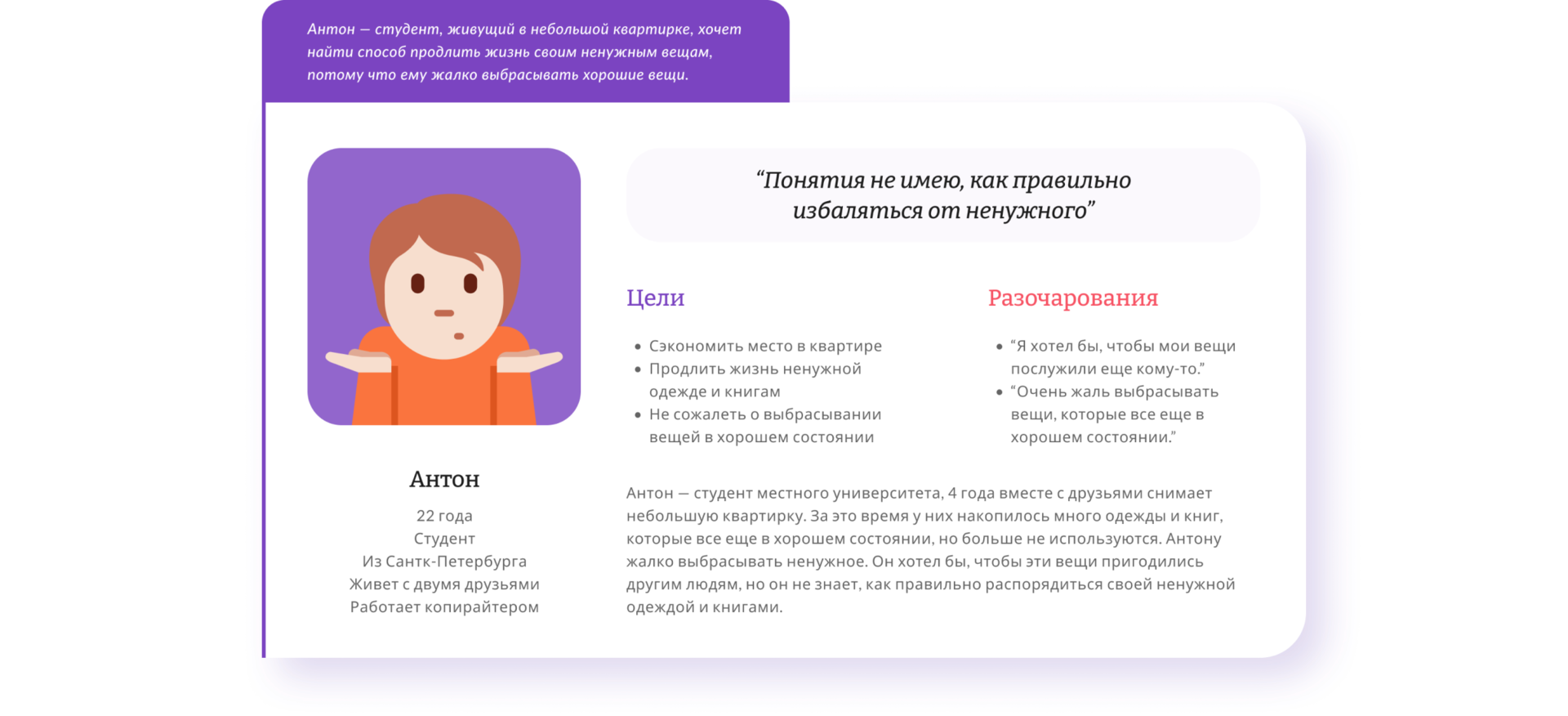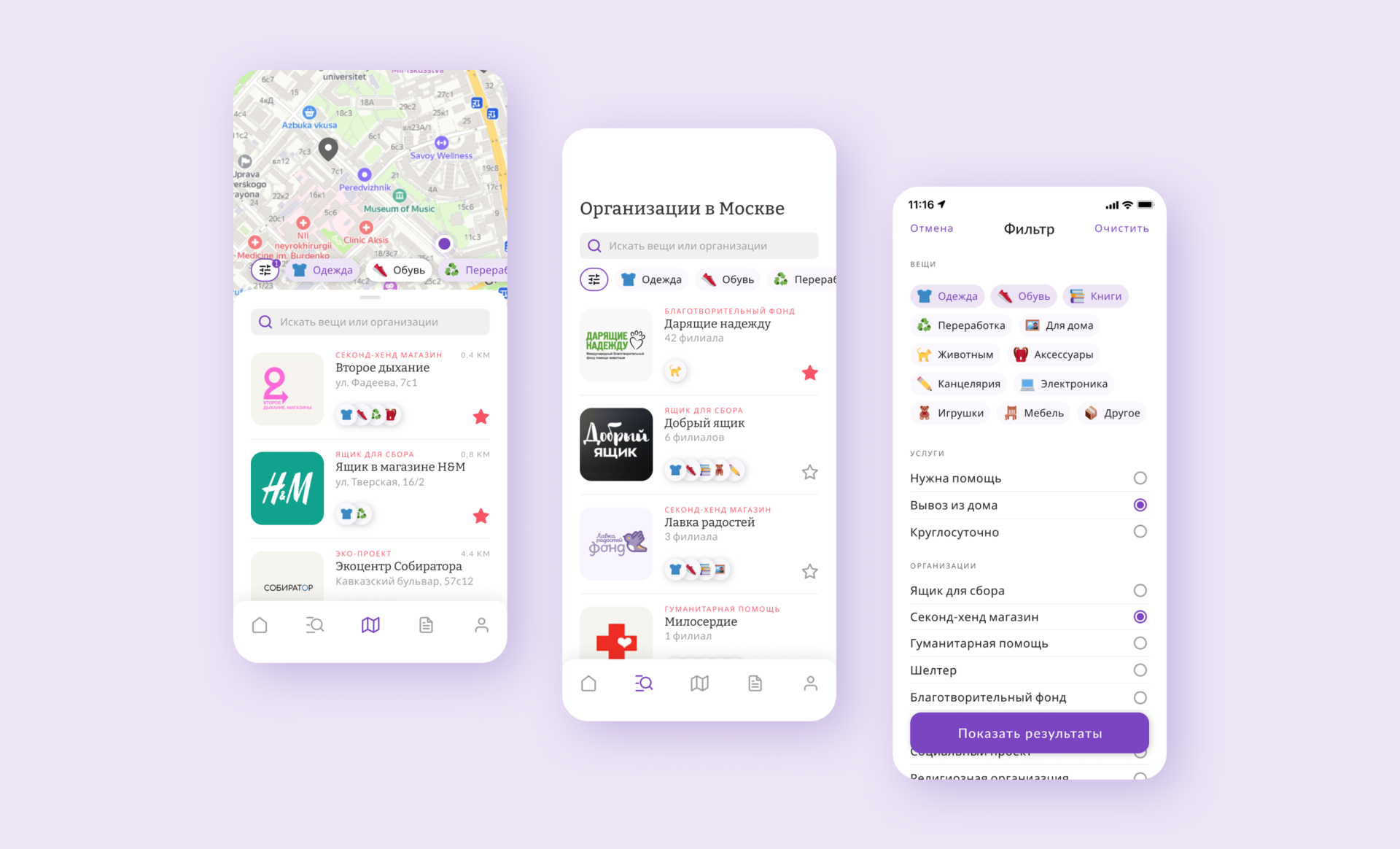 В интервью принимало участие 8 человек, которые в целом подтвердили мои гипотезы. Основная группа пользователей, выявленная в ходе исследования, — это осознанные потребители, живущие в крупных городах, которые, по крайней мере, раз в год во время уборки или переезда избавляются от вещей, которые им больше не нужны. Половина участников сообщили, что выбрасывают вещи, которые не удалось продать или отдать знакомым, потому что не знают, что с ними делать. Другая половина участников сообщили, что ненужные вещи они передают в известные им организации. Также они сообщили, что испытывали трудности при поиске местных организаций, используя существующие поисково-информационные службы.